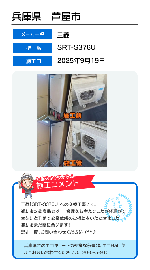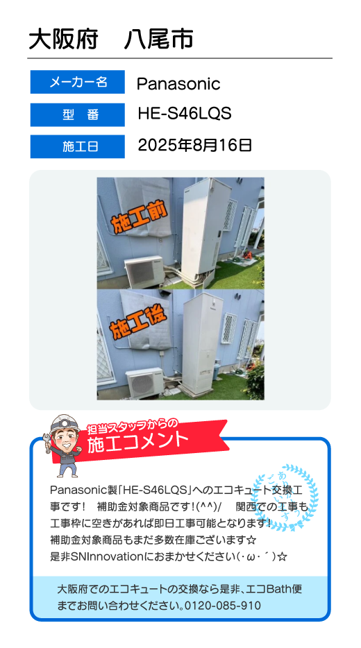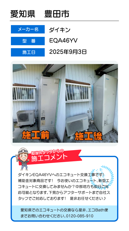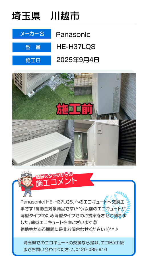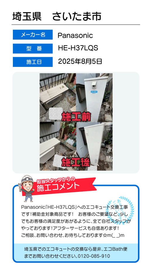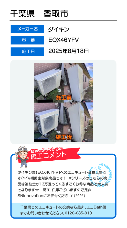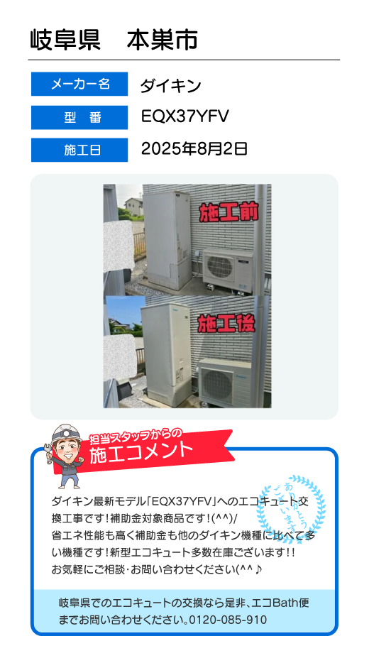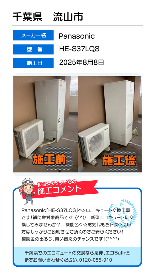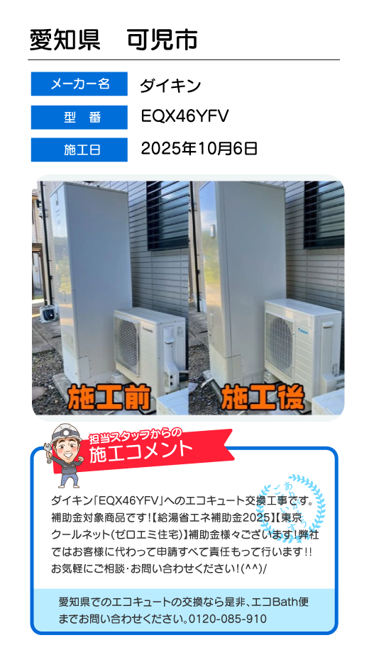 関東一円(東京/千葉/埼玉/神奈川/群馬/栃木/茨城)でのエコキュート工事はお任せ下さい!エコBath便(エコバス便)はエコキュート交換専門です。日曜・祝日にも対応!急ぎの翌日スピード工事もお任せ下さい。たくさんのエコキュート工事の実例をご紹介します。